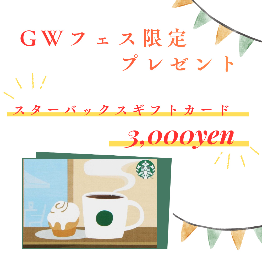 ご予約の上、G.Wフェス期間中にご来店&15万円(税込)以上オーダーいただいた方に、「スターバックスギフトカード3,000円」をプレゼントいたします