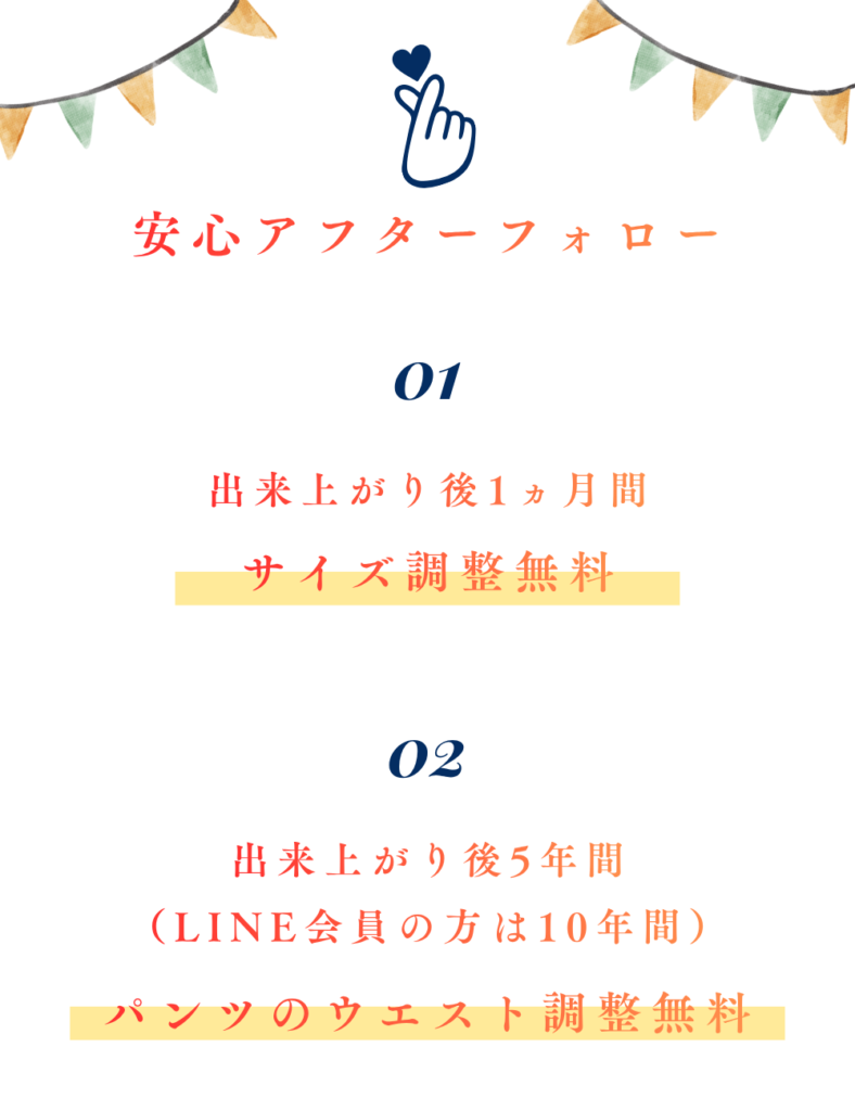 5年間はパンツのウエストサイズ調整無料!