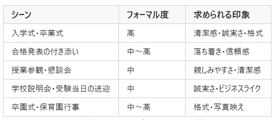 このうち入学式・卒業式は最もフォーマル度が高く、スーツの格が試される。合格発表や授業参観は「きちんとしているけど堅苦しくない」バランスが求められる。1着で対応するには、フォーマル度を落とさず、小物の調整で雰囲気を変えられるスーツを選ぶことが鍵となる。